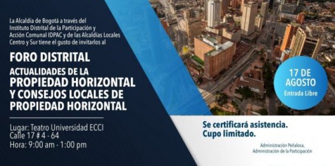 La alcaldía de Bogotá a través del Instituto Distrital de Participación y Acción comunal IDPAC y las Alcaldías Locales Zona centro y Zona Sur, tiene el gusto de invitarlos al FORO ACTUALIDADES DE LA PROPIEDAD HORIZONTAL Y CONSEJOS LOCALES DE PROPIEDAD HORIZONTAL.