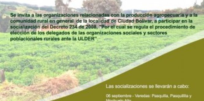 Se invita a las organizaciones sociales y sectores poblacionales rurales de la localidad Ciudad Bolívar, como organizaciones agrarias o agropecuarias, juntas de acción comunal, jóvenes, mujeres y adultos mayores, así como a toda la comunidad en general, entre otros, a participar en la socialización del Decreto 234 de 2008, "Por el cual se regula el procedimiento de elección de los delegados de las organizaciones sociales y sectores poblacionales rurales ante las Unidades Locales de Desarrollo Local y se dictan otras disposiciones".