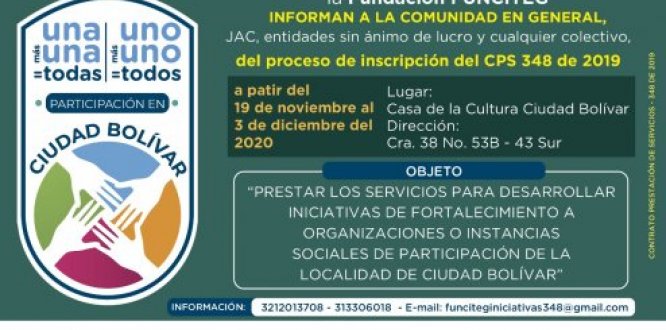 #Atención entidades y colectivos:  los invitamos a conocer la convocatoria para procesos de participación en la localidad. Acércate hasta el 3 de diciembre a la casa de la cultura. #CiudadBolivarParticipa